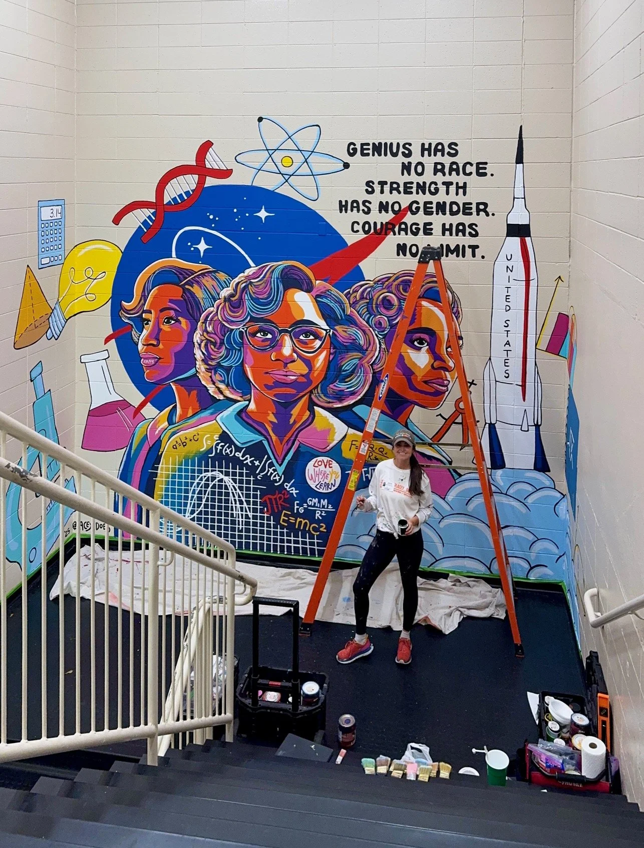 I’m a list gal. I start by interviewing my client and identifying their goals. Both visual and financial and I make a list of every must have, then take all that feedback and create a concept adding in my own elements to make it all come together. I always end up doing research. Whether its of the area, or background on the business, the concept itself, I’m googling. I’m pulling photos and drawing inspiration from that feedback. Then I head to my iPad and use Procreate to the digital design and I always create it to-scale so when its time to paint, I can toss the image up on the wall with a projector. I like to work smarter not harder. This helps with speed. Then I joke it’s one giant colouring book after I lay down the outlines. 1-2 days later, on average, you have a brand new, beautiful wall!
